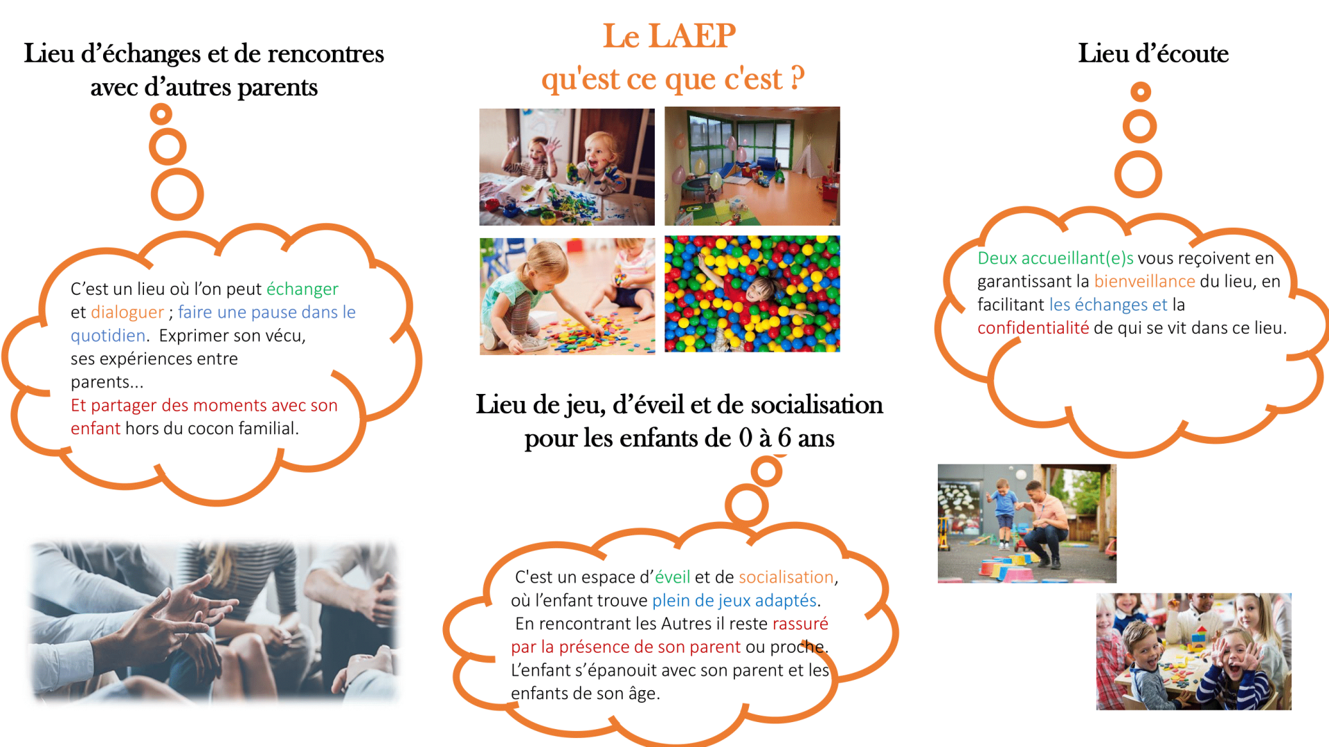 Gratuit, anonyme et sans inscription. Le LAEP est un espace convivial pour les enfants de la naissance jusqu'à 6 ans, accompagnés de leurs parents ou d'un adulte référent. Les futurs parents sont aussi les bienvenus.